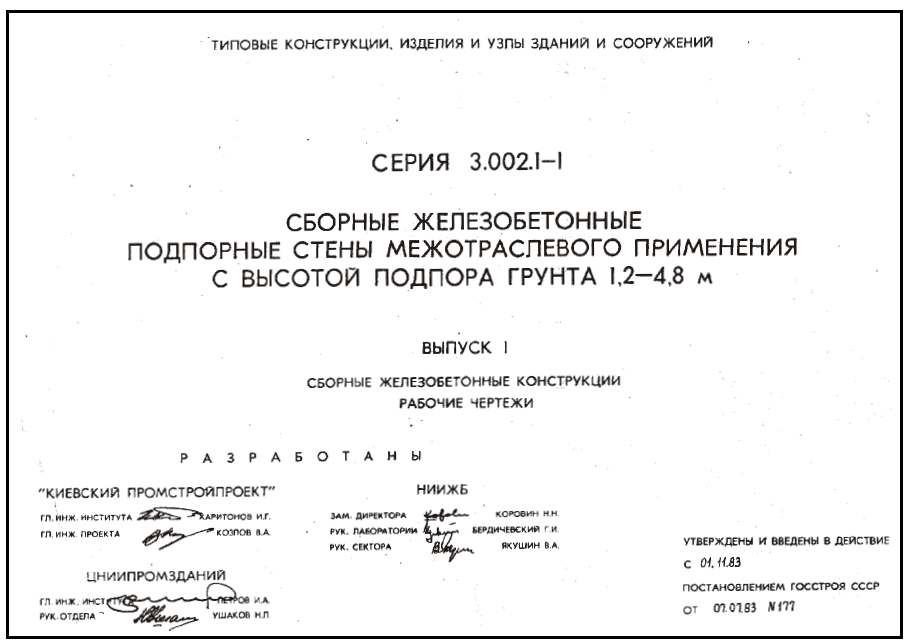 Серия 3.002.1-1. Сборные железобетонные подпорные стены межотраслевого применения с высотой подпора грунта 1.2-4.8 м