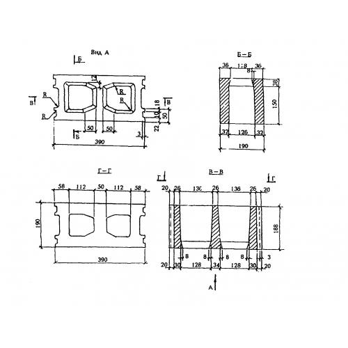Камни для кладки стен КСР-ПР-ПС 39. Унифицированные изделия, имеющие прямоугольную форму с рядом конструктивных особенностей в виде выступов, углублений и отверстий.